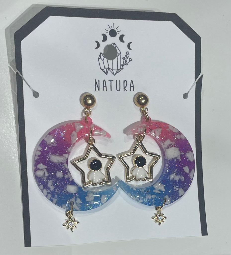 Locally made. Blue, purple and pink cloud colored resin earrings. Astronaut or star pendant.