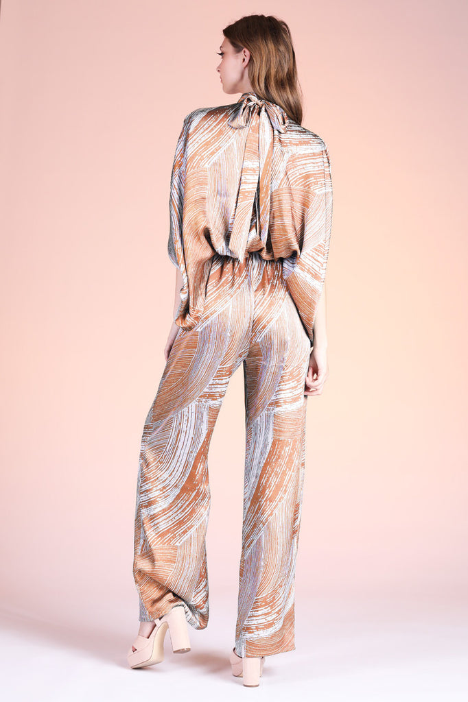 Our Barcelona Satin Mock Neck Caftan Jumpsuit will have you feeling like you need a vacation this fall! This satiny printed fabric with kimono sleeves and tie on the back will give you the elevated look you need for any occasion!