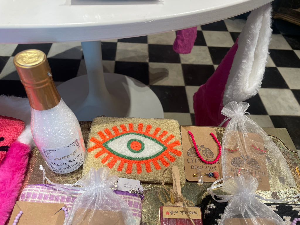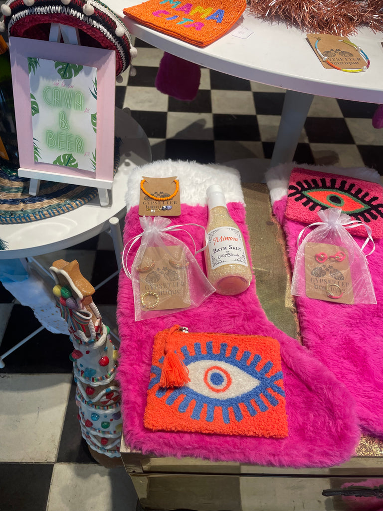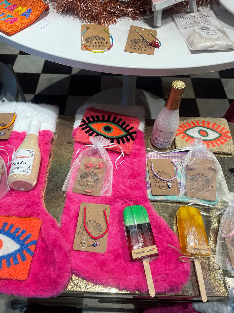 Choose from different items to customize the perfect stocking for your Gypsetter. All stockings include one pink stocking, your choice of one soap or bath salts, one bracelet, one ring, one set of earrings and one bag. For a limited time only.